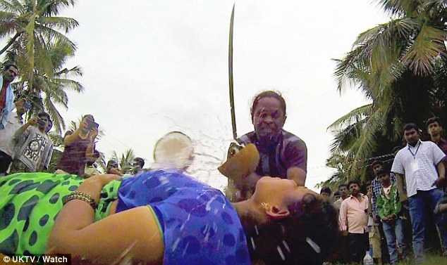 (VTC News) - Ông Budati đến từ Ấn Độ thực hiện màn trình diễn vô cùng nguy hiểm khi đặt trái dừa lên cổ vợ và dùng dao chặt vỡ đôi quả dừa.