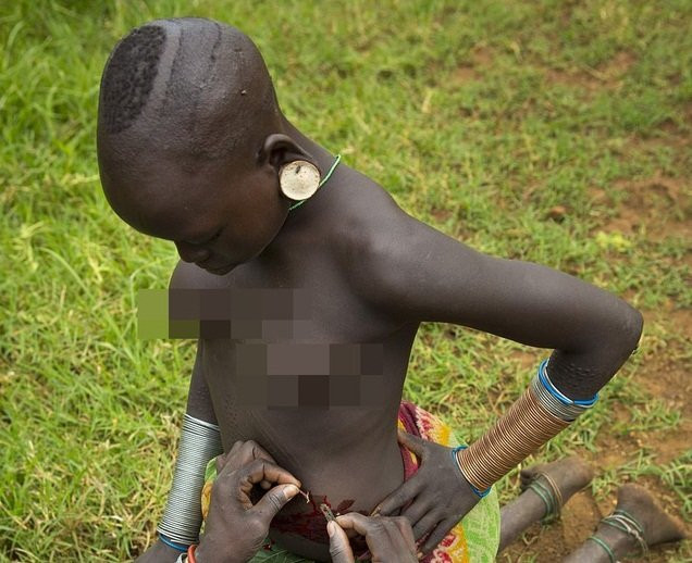 Những bé gái 12 tuổi ngồi im lặng, cắn răng chịu đau khi mẹ mình dùng dao sắc rạch thẳng lên cơ thể tạo thành các vết sẹo lồi trong ngày lễ trưởng thành. Đây là nghi lễ đánh dấu các bé gái đã bước sang giai đoạn trưởng thành.