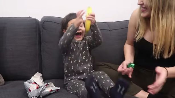 Cô bé vui sướng khi thấy món quà Noel là quả chuối.