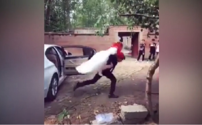 Được chú rể cõng, cô dâu ngã văng ra đất