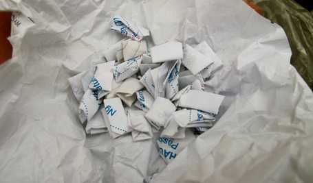 Bên trong bọc giấy là 34 tép giấy nhỏ chứa chất bột màu trắng. Cảnh sát nhận định nhiều khả năng đây là ma túy.
