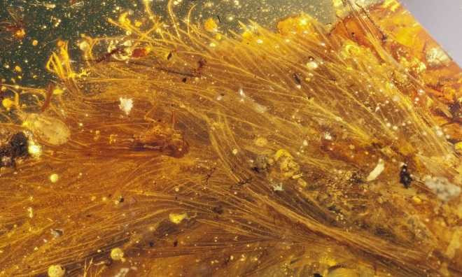 Khối hổ phách chứa khúc đuôi khủng long với những sợi lông vũ bao phủ được phát hiện tại một khu chợ ở Myanmar, được cho là thuộc về một con khủng long nhỏ sống cách đây 99 triệu năm.