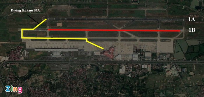 Đường băng 1B (đường màu đỏ) sẽ đóng cửa để sửa chữa. Đường lăn tạm S7A sẽ được xây dựng để kết nối đường băng 1A với nhà ga. (Đồ họa: Ngọc Tân)