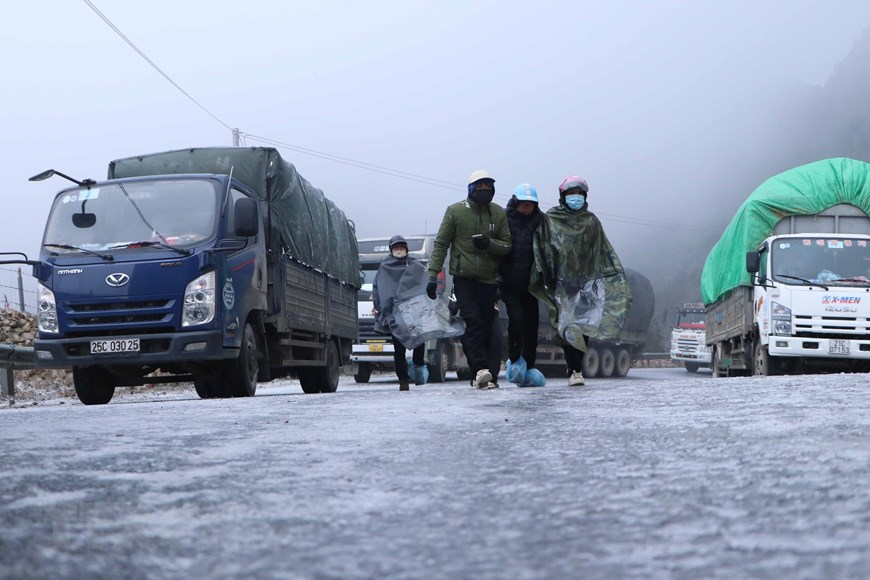Băng phủ kín mặt đường đoạn đèo Ô Quy Hồ thuộc địa phận tỉnh Lai Châu đi Sa Pa khiến các phương tiện không thể lưu thông. (Ảnh: Nguyễn Oanh/TTXVN)