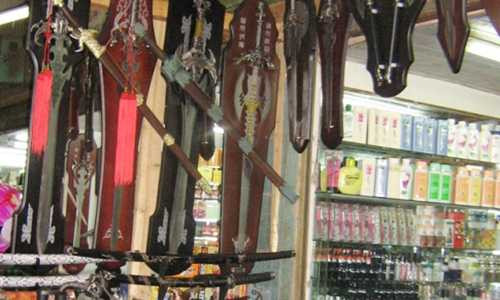 | Cận cảnh một gian hàng bán các loại đao kiếm. |