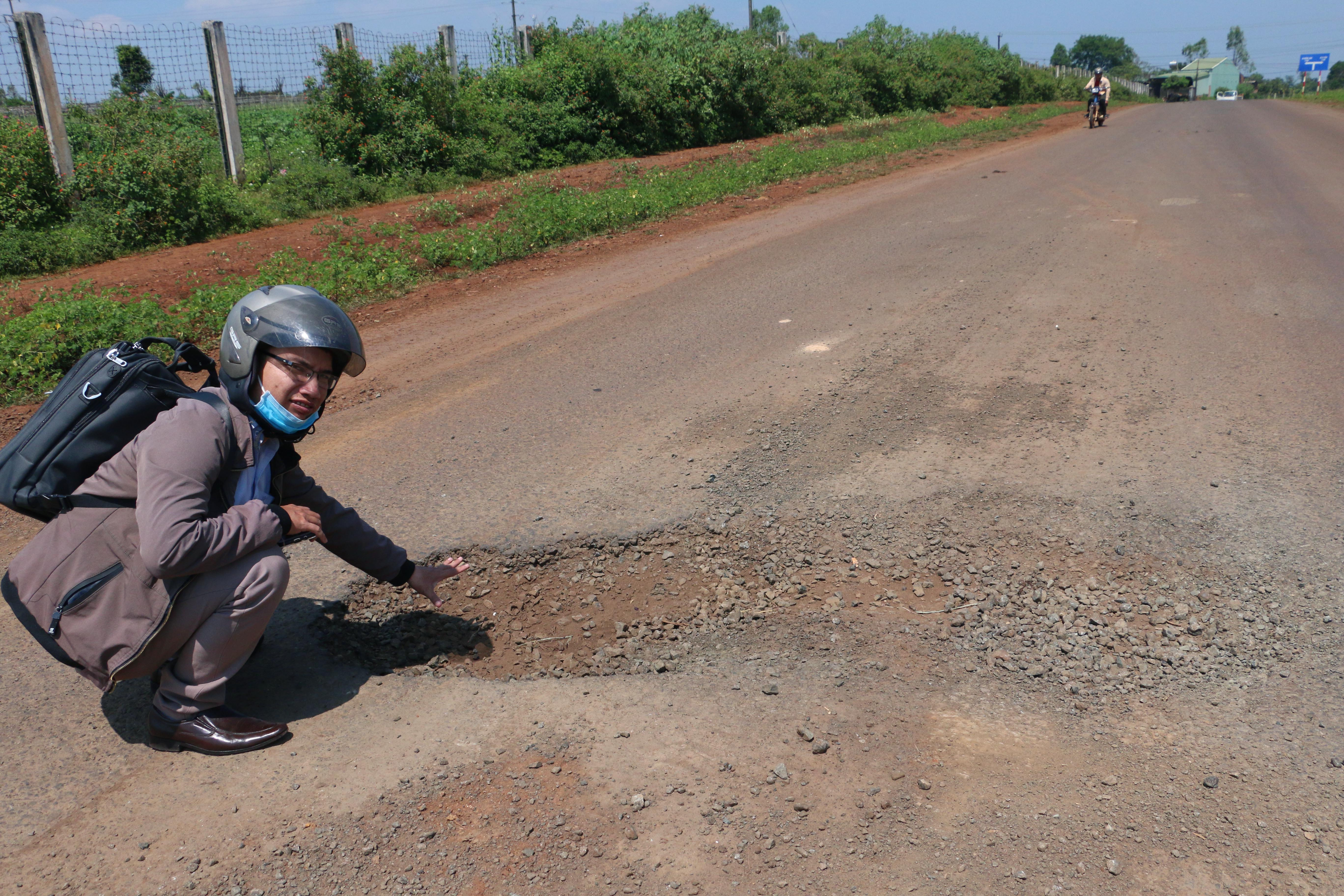 Lớp nhựa bung khiến mặt đường mất an toàn.
