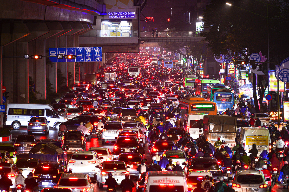 Đến khoảng 19h cùng ngày, các tuyến đường nội đô vẫn chật cứng xe cộ, người dân chen chúc dưới trời mưa rét buốt.