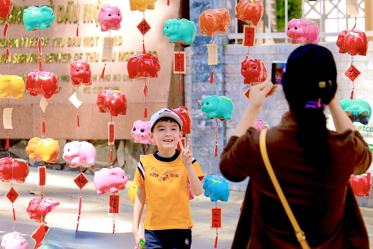 "Thiên đường" heo đất này được trưng bày trên đường Quang Trung, đoạn dẫn vào Trung tâm hành chính phường Thủ Dầu Một. Công trình chào đón Tết này do chính quyền địa phương thực hiện.