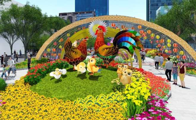 Khởi đầu của phân đoạn Mùa xuân trên thành phố mang tên Bác là cổng Đường hoa 2017 với đại cảnh Xuân sum họp khắc họa hình ảnh gia đình gà đầm ấm, sung túc. Linh vật của đường hoa được thiết kế thành nhiều hình dáng vui tươi, hoạt động sôi nổi, gia đình gà mang đến thông điệp thuận lợi và thịnh vượng.