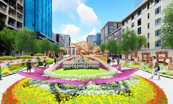 Khu vực Tượng đài Chủ tịch Hồ Chí Minh được trang trí những luống hoa dọc 2 làn hoa hiện hữu, gồm 36 chậu mai vàng điểm xuyến sắc hồng hoa đào tạo thành con đường đường rực rỡ sắc xuân dẫn đến Tượng đài Bác Hồ.