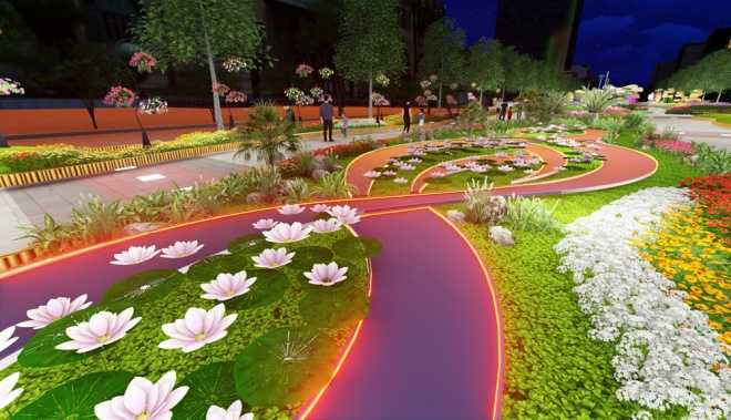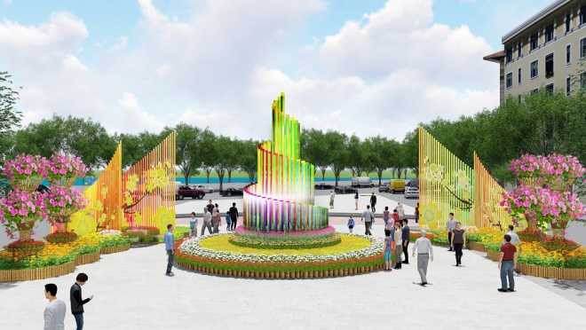 Tiểu cảnh Đài sen hồng gồm những đóa sen cách điệu với thân dáng mềm mại giống đôi tay nâng đài sen đang vươn lên, tỏa sáng. Liền mạch là đôi luống hoa uốn lượn mang ý nghĩa đánh dấu sự chuyển mình lớn, hội nhập và phát triển bền vững của thành phố.