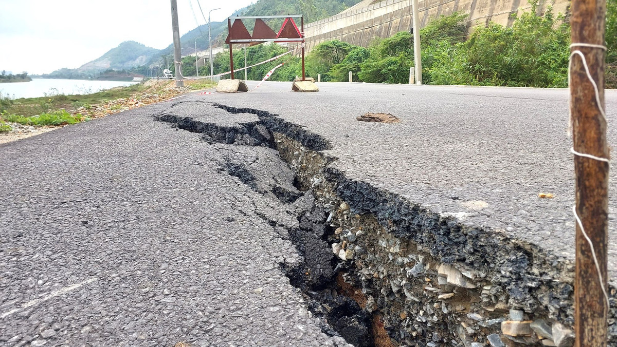Đoạn đường vừa thảm nhựa bị sụt lún, nứt gãy dài hàng trăm mét.