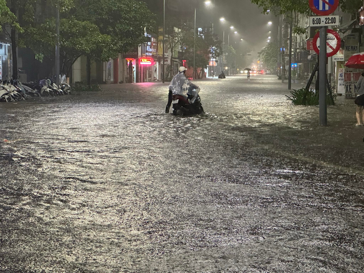 Đường Lê Quý Đôn đoạn giao với khu vực ngã 6 trung tâm TP Huế cũng bị ngập khoảng 0,2-0,3 mét khiến các phương tiện lưu thông khó khăn.