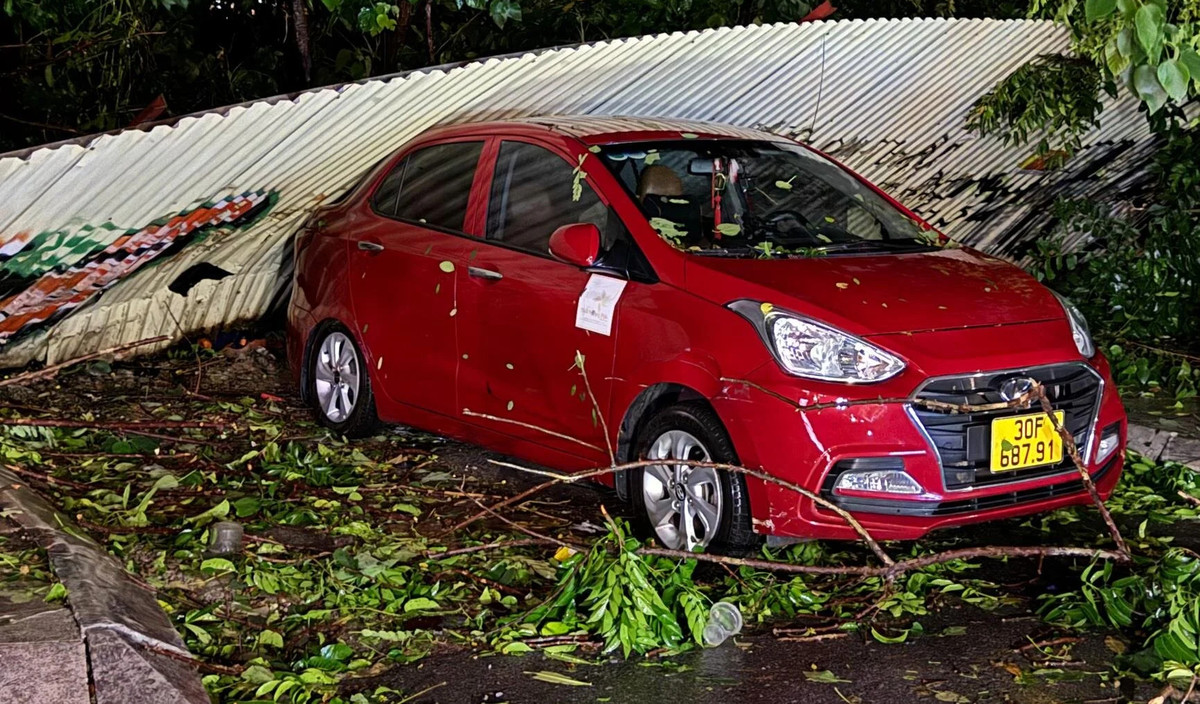 Nhiều biển quảng cáo, mái tôn... đổ la liệt dưới lòng đường, đè lên xe ô tô.