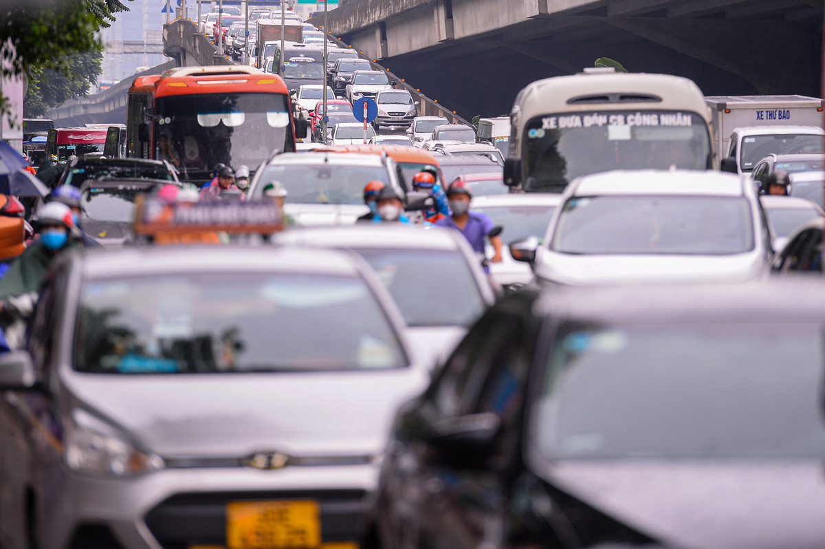 Dòng phương tiện phải xếp hàng 3, nhích từng mét để di chuyển trên đường.