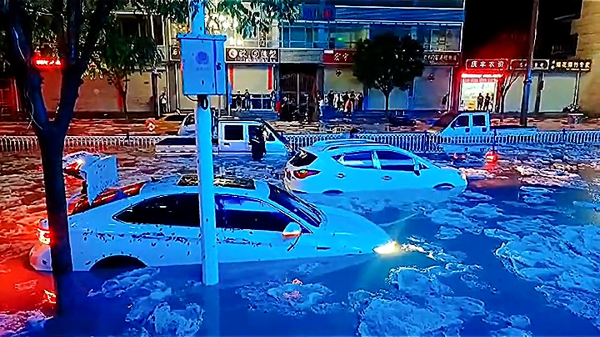 Đường phố tại tỉnh Cam Túc, Trung Quốc biến thành “sông băng” sau trận mưa đá khiến người dân và các phương tiện di chuyển khó khăn.