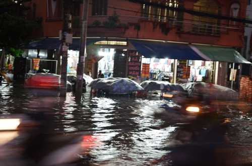 Ghi nhận của PV, mưa lớn đã làm hàng loạt tuyến đường như Nguyễn Hữu Cảnh, Ung Văn Khiêm, Ngô Tất Tố (quận Bình Thạnh); Kinh Dương Vương (quận Bình Tân), Phạm Thế Hiển (quận 8); Huỳnh Tấn Phát, Nguyễn Văn Linh (quận 7); Lương Thế Vinh, Lương Minh Nguyệt (quận Tân Phú)...mênh mông nước.