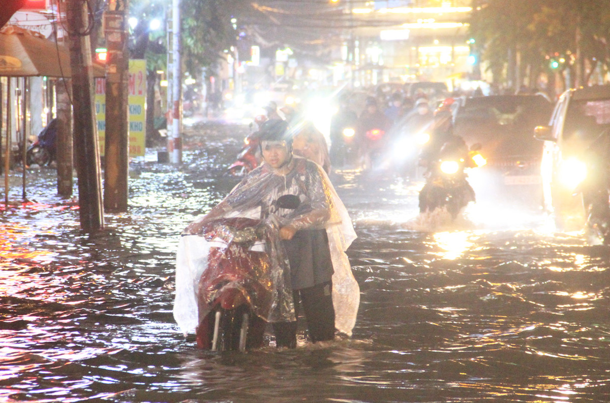 Mưa lớn vào giờ tan tầm khiến nhiều người vất vả vượt biển nước.