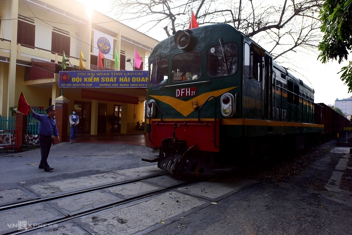 Tàu hàng liên vận Việt - Trung tại khu kiểm soát hải quan Lào Cai giữa tháng 2/2020. (Ảnh: Giang Huy)