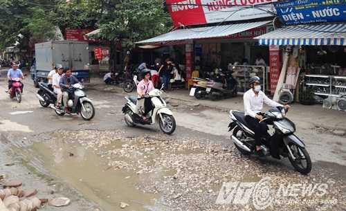| Nhiều người đi xe máy phải dừng lại vì hố gà quá lớn |