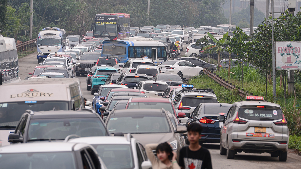 Ô tô, xe máy chen kín từng mét đường, tạo nên những "điểm nghẽn" không lối thoát ngay từ cửa ngõ vào khu di tích.