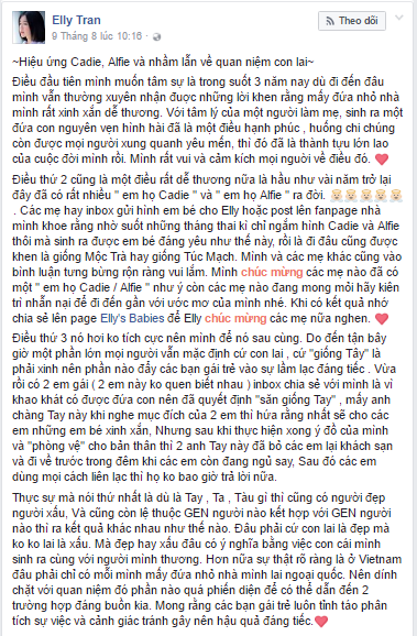 Không chỉ "khoe" hiệu ứng từ 2 bé con đáng yêu, Elly còn nhắc chị em phụ nữ đừng vì ham con lai mà bán rẻ cuộc đời mình bằng 2 ví dụ "người thật việc thật". Bởi trên thực tế, dù là Tây hay Tàu thì cũng có người tốt kẻ xấu, chứ không chắc cứ Tây là tốt và cứ ta là xấu. Hay thậm chí là trong cả giống nòi sinh con.