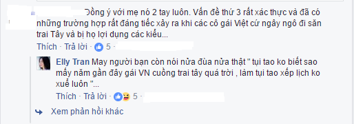 Nhiều người khi đọc dòng chia sẻ của Elly cũng bày tỏ sự đồng tình, có người gay gắt hơn lại chỉ trích quan đểm quen "bạn trai Tây" của một số cô gái hiện nay.