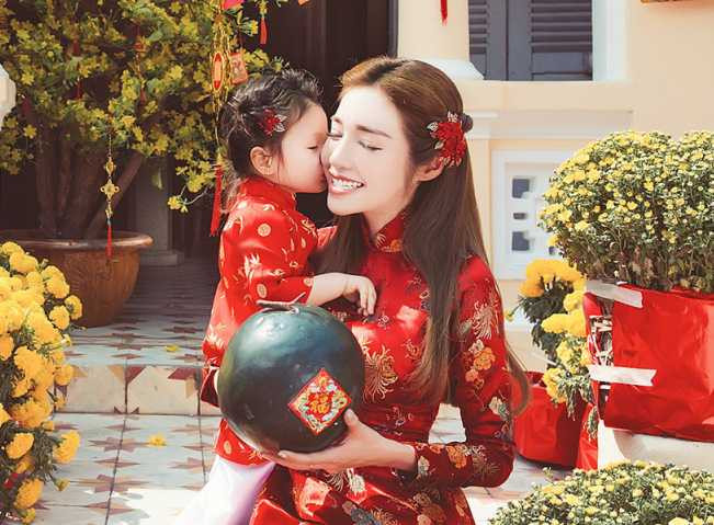| Đặc biệt, đây là bộ ảnh Tết đầu tiên mà Elly Trần đưa con gái – bé Cadie Mộc Trà chụp cùng nhau. |