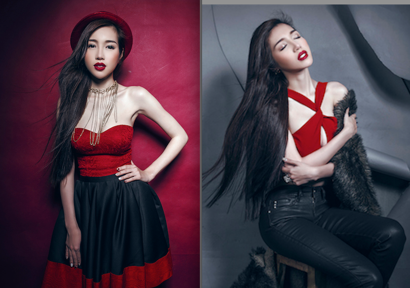 | Nữ diễn viên tự tin khoe dáng trong trang phục đỏ cá tính và khuôn mặt được make up kỹ càng. |