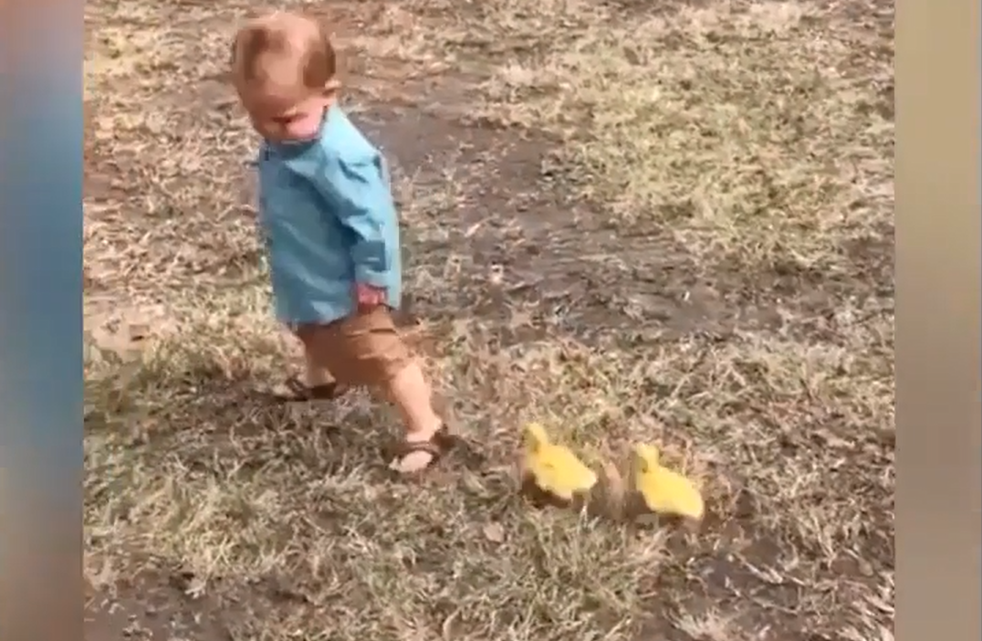Em bé bỏ chạy khi bị 2 chú vịt con 'bám đuôi'