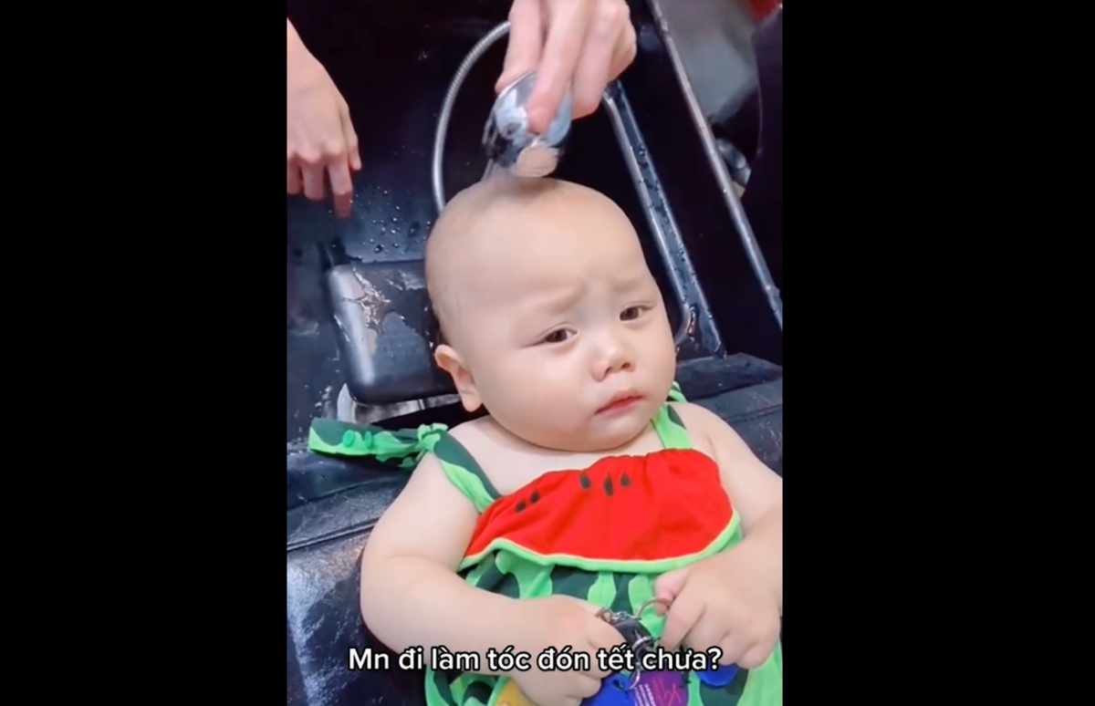 Vẻ mặt hoang mang của em bé khi được "làm đầu" đón Tết khiến ai nấy khó nhịn cười vì quá đáng yêu.