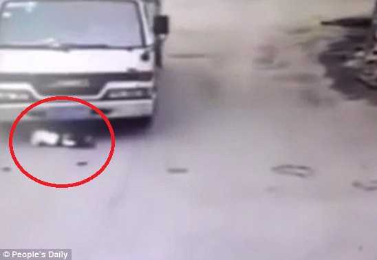 Em bé ngồi chơi giữa đường đúng lúc xe tải lùi và tài xế khuất tầm nhìn, em bèn nhanh trí nằm úp xuống đường, nhờ vậy đã sống sót kỳ diệu sau khi bị "nuốt chửng" dưới gầm xe.
