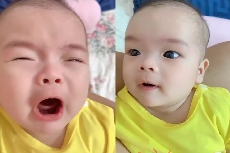Em bé vừa gào khóc vừa hé mắt canh chừng bố