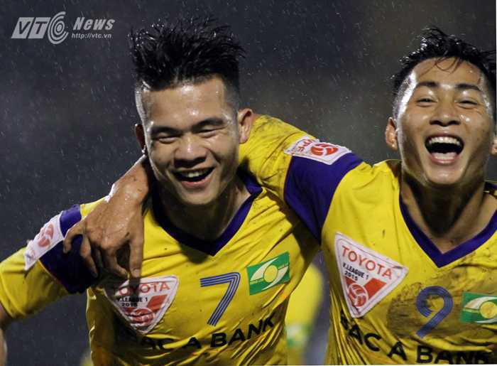 | Hoàng Thịnh và Tuấn Tài ăn mừng bàn thắng vào lưới Thanh Hóa |