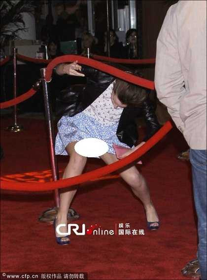 Nhưng nữ diễn viên 22 tuổi này lại vô tư đến mức xoạc chân và chui qua hàng rào bảo vệ để hớ hênh lộ nội y trước hàng chục ống kính phóng viên.