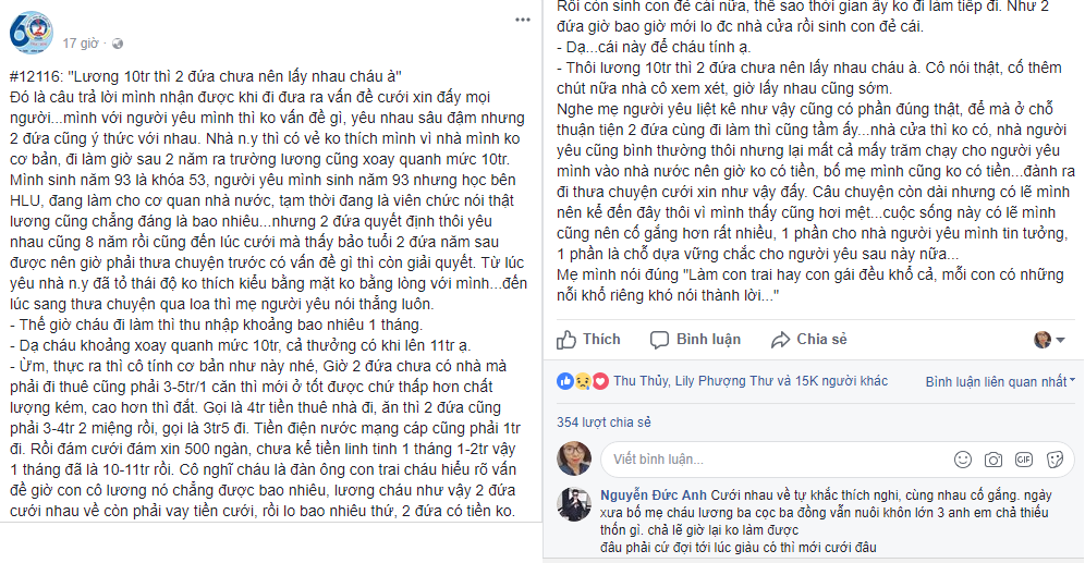 Facebook Nguyễn Đức Anh bình luận: “Cưới nhau về tự khắc thích nghi, cùng nhau cố gắng. Ngày xưa bố mẹ cháu lương ba cọc ba đồng vẫn nuôi khôn lớn 3 anh em chả thiếu thốn gì. Chả lẽ giờ lại ko làm được. Đâu phải cứ đợi tới lúc giàu có thì mới cưới đâu”. (thu hút gần 1000 lượt like).