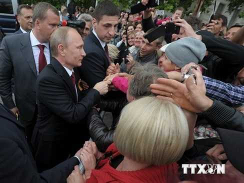 | Tổng thống Vladimir Putin (trái) gặp gỡ người dân địa phương trong chuyến thăm bán đảo Crưm |