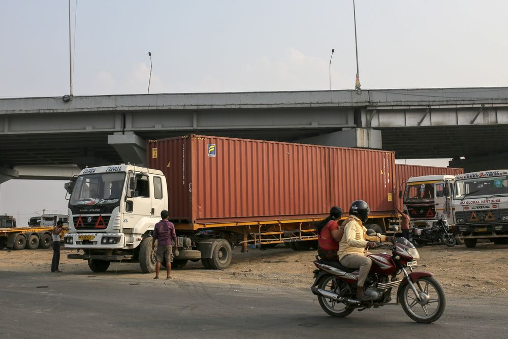 Xe tải vận chuyển các container hàng hóa gần cảng Jawaharlal Nehru ở Navi Mumbai, Maharashtra, Ấn Độ. (Ảnh: Bloomberg)