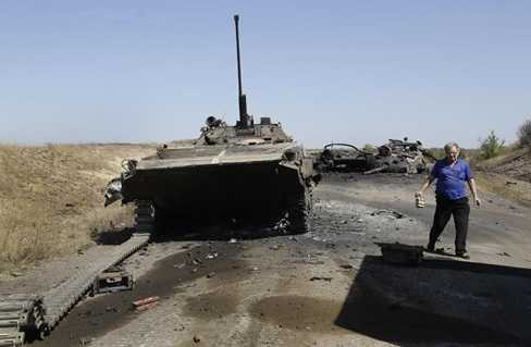 | Một chiếc xe tăng của quân đội Ukraine bị phá hủy ở gần làng Novokaterynivka sau cuộc giao tranh |