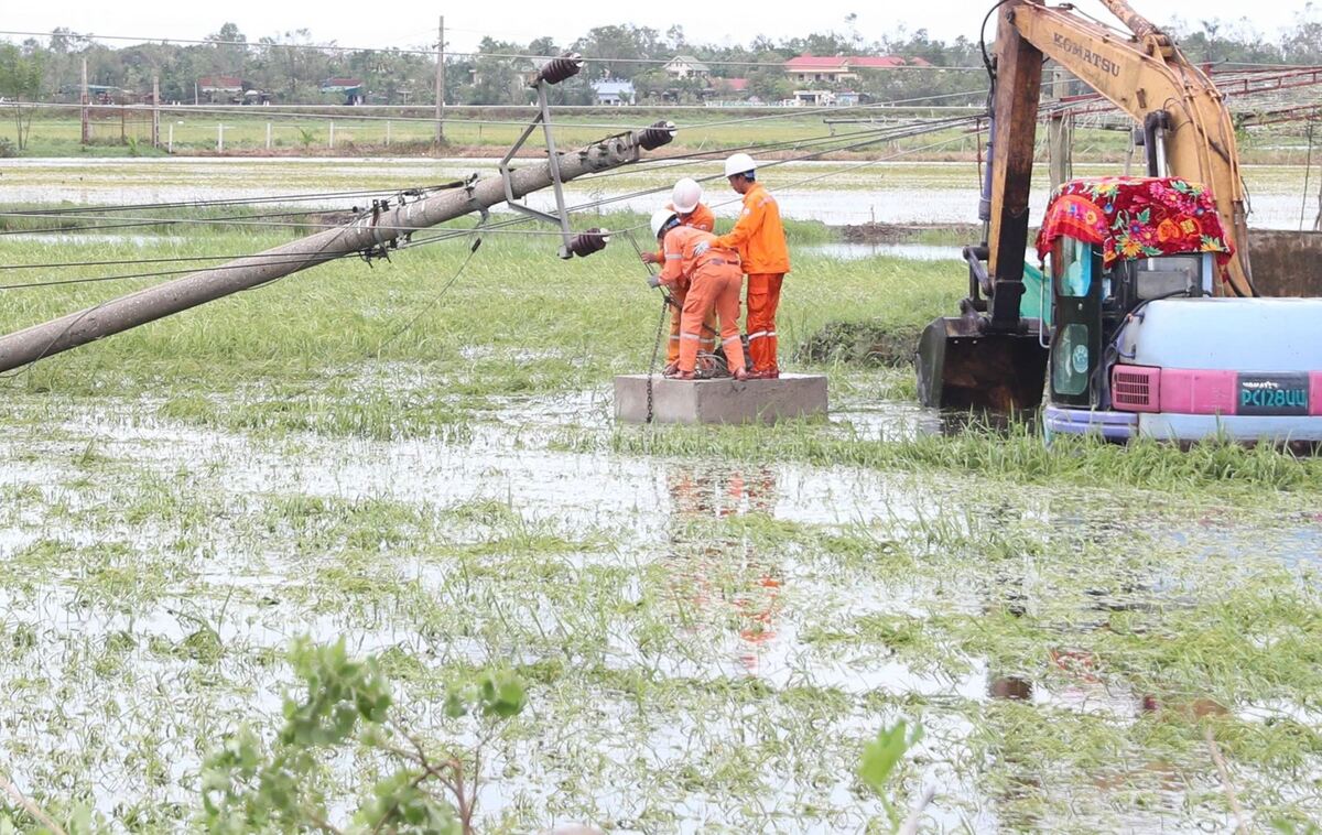 Công nhân ngành Điện khắc phục sự cố bão số 5.