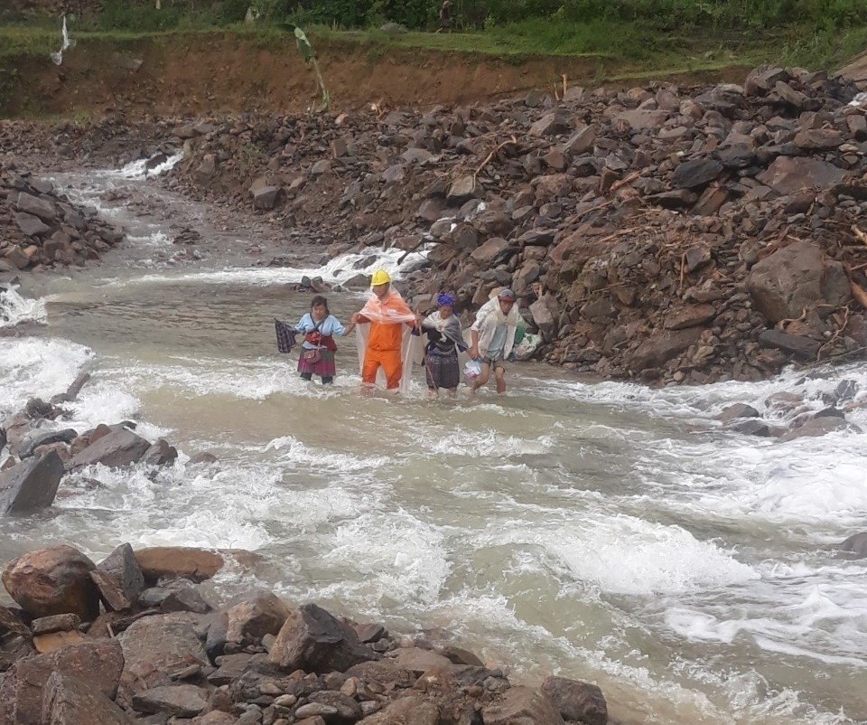Công nhân Điện lực Than Uyên, PC Lai Châu giúp người dân qua suối.