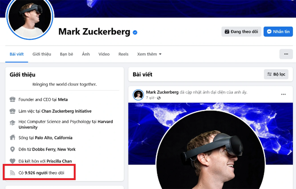 Trang cá nhân CEO Facebook Mark Zuckerberg hiển thị số người theo dõi chỉ còn 9.927 follow dù trước đó gần 120 triệu người theo dõi. (Ảnh chụp màn hình)