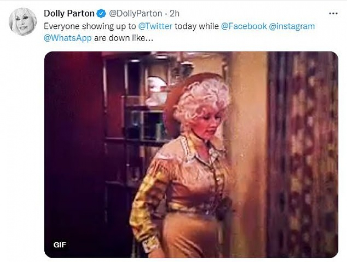 Tài khoản của nữ ca sĩ nhạc đồng quê Dolly Parton đã đăng hình ảnh vui nhộn, miêu tả cảnh mọi người ồ ạt lao vào Twitter khi Facebook bị lỗi, ngừng hoạt động.