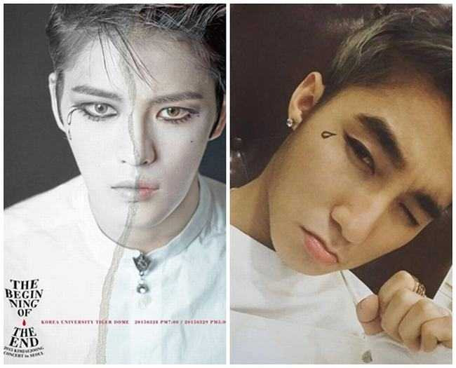Hình ảnh mới này của Sơn Tùng với nguyên cây trắng nổi bật và giọt nước mắt được vẻ trên mặt khá giống với lối trang điểm của các chú hề lại vô tình trùng hợp với tạo hình trong poster quảng bá concert “The Beginning of the End” của anh chàng điển trai JaeJoong (JYJ) vào ngày 13/03 vừa qua.