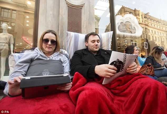 | Fenella Barnes và Harry Barrington đem cả chăn đi để chống chọi với cái lạnh trong khi chờ mua iPad 3 - tại London |