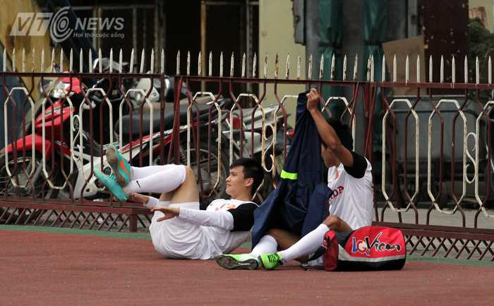 ĐT Việt Nam tới sân khi tuyển Sinh viên Hàn Quốc vẫn còn đang tập. Tranh thủ ngồi chờ, Công Vinh và Quang Hải tập giãn cơ ngay trên đường piste gần cửa vào sân.