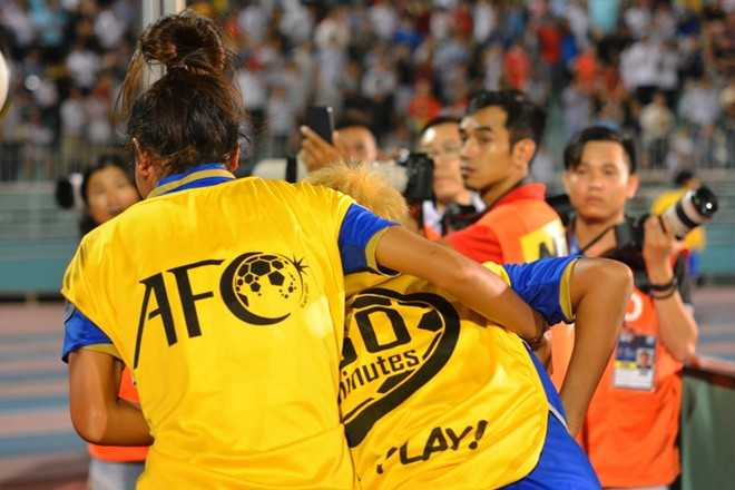 Tuy đã ép sát đường biên cuối sân để tránh nhưng hậu vệ số 5 Kwanruethai Kunupatham vẫn dính nguyên 1 chai nước ngay người khiến chị đổ gục xuống sân. Đồng đội phải nhanh chóng dìu cầu thủ này đến nơi khác. Trước đó, khi ĐT Thái Lan nâng tỷ số lên 2-0, một số CĐV quá khích đã thực hiện những hành vi không đẹp này, suýt trúng những phóng viên tác nghiệp trên sân.