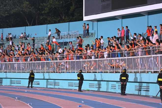 Nhóm cổ động viên quá khích Việt Nam trên sân Thống Nhất đã ném chai lọ, vật cứng, suýt gây thương tích cho một cầu thủ Thái Lan.
