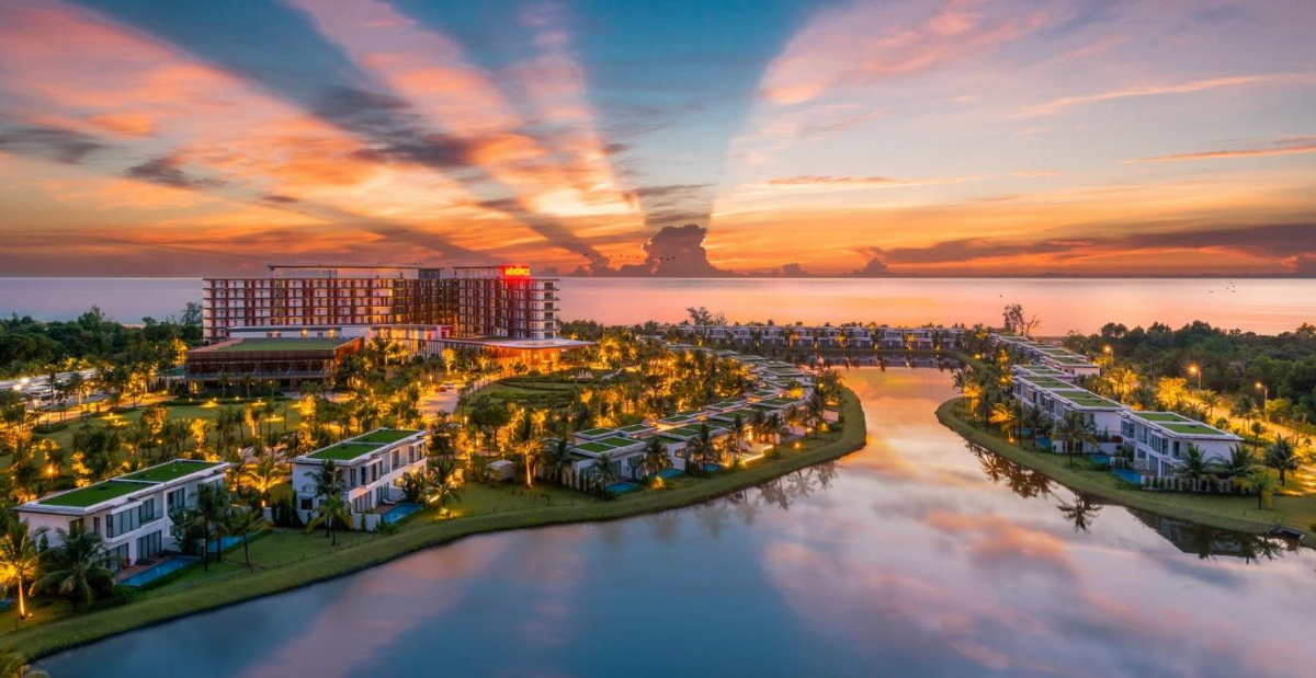 Toàn cảnh Felicity Phu Quoc dưới ánh hoàng hôn rực rỡ bên Bãi Ông Lang. Khu nghỉ dưỡng biển tốt nhất châu Á - do Haute Grandeur Global Awards bình chọn năm 2021 được biết tới là điểm đến riêng tư, sang trọng để du khách tận hưởng kỳ nghỉ bình yên bên gia đình.