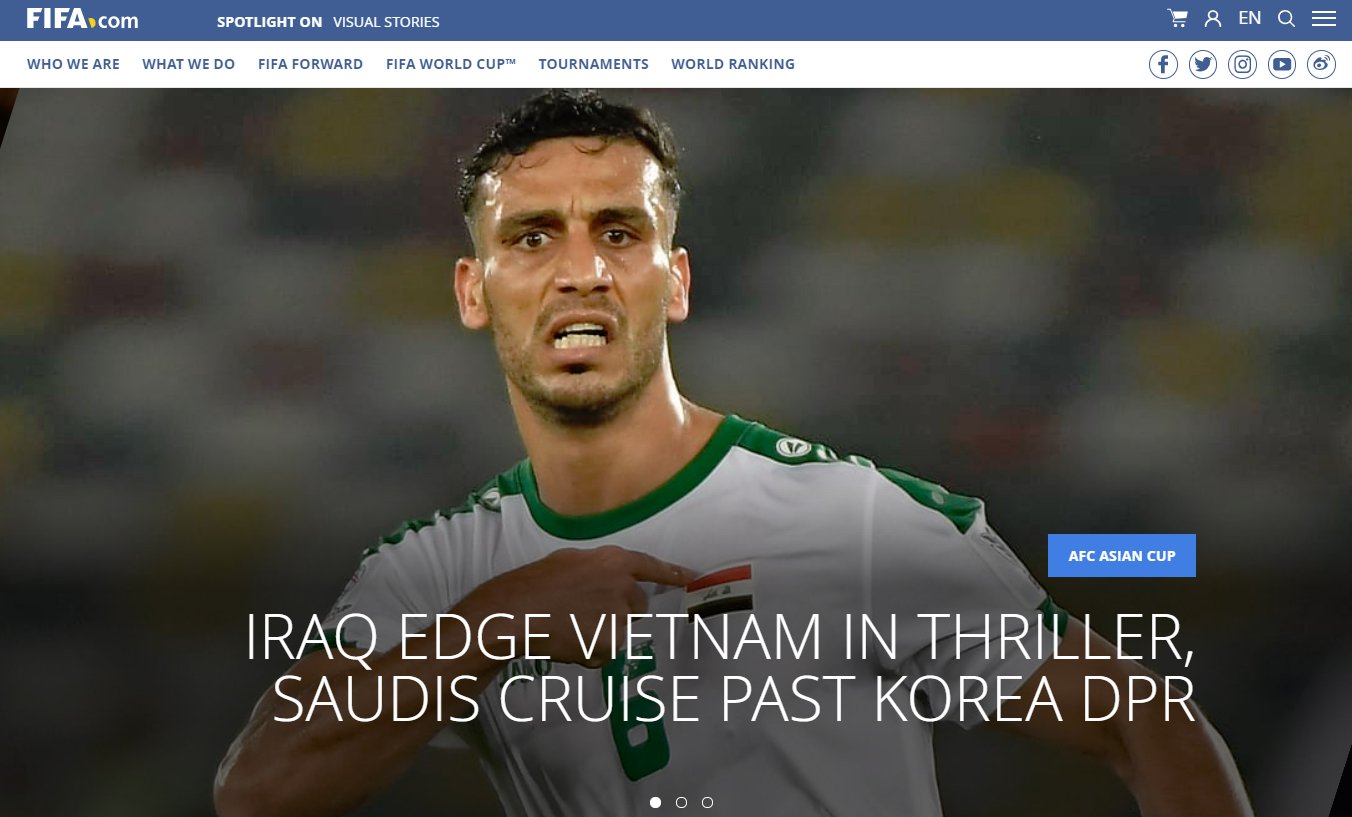 Asian Cup là giải đấu nằm trong hệ thống thi đấu của Liên đoàn bóng đá Thế giới (FIFA) nên được cập nhật liên tục trên trang chủ của tổ chức này. Và trận đấu giữa Việt Nam và Iraq tối 8/1 được FIFA coi là trận đấu hay nhất kể từ đầu giải.
